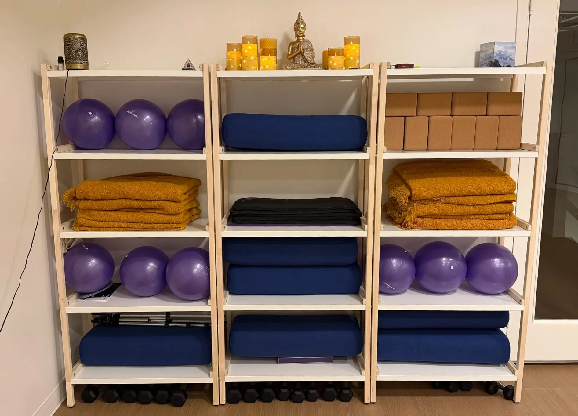 The space features a bright, welcoming atmosphere with ample natural light, yoga props and equipment, and a thoughtfully designed layout that supports both movement and relaxation.